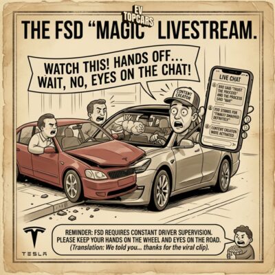 Tesla FSD demo livestream today: “Watch this! Hands off, eyes on the road… wait no, eyes on the chat!” Driver: