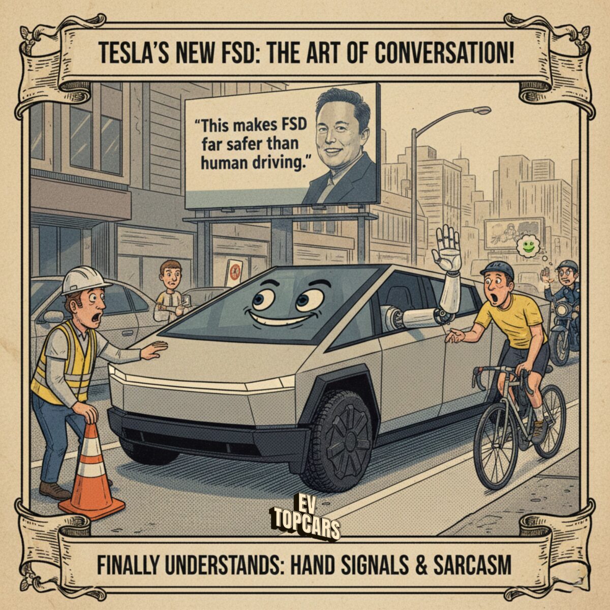 FSD before: “I see a human flailing. Probably nothing. Proceed at full confidence.” FSD after: “Ah yes, the universal ‘STOP YOU IDIOT’ gesture. Yielding like a pro.”