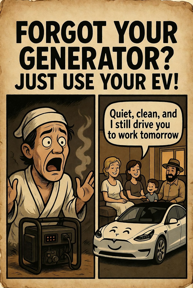 While your neighbor is out there wrestling with a loud, smelly gas generator and praying it doesn’t run out of fuel at 2 a.m., you’re just plugging your fridge, Wi-Fi, and CPAP machine into your Tesla (or any V2H-capable EV) and chilling like nothing happened.