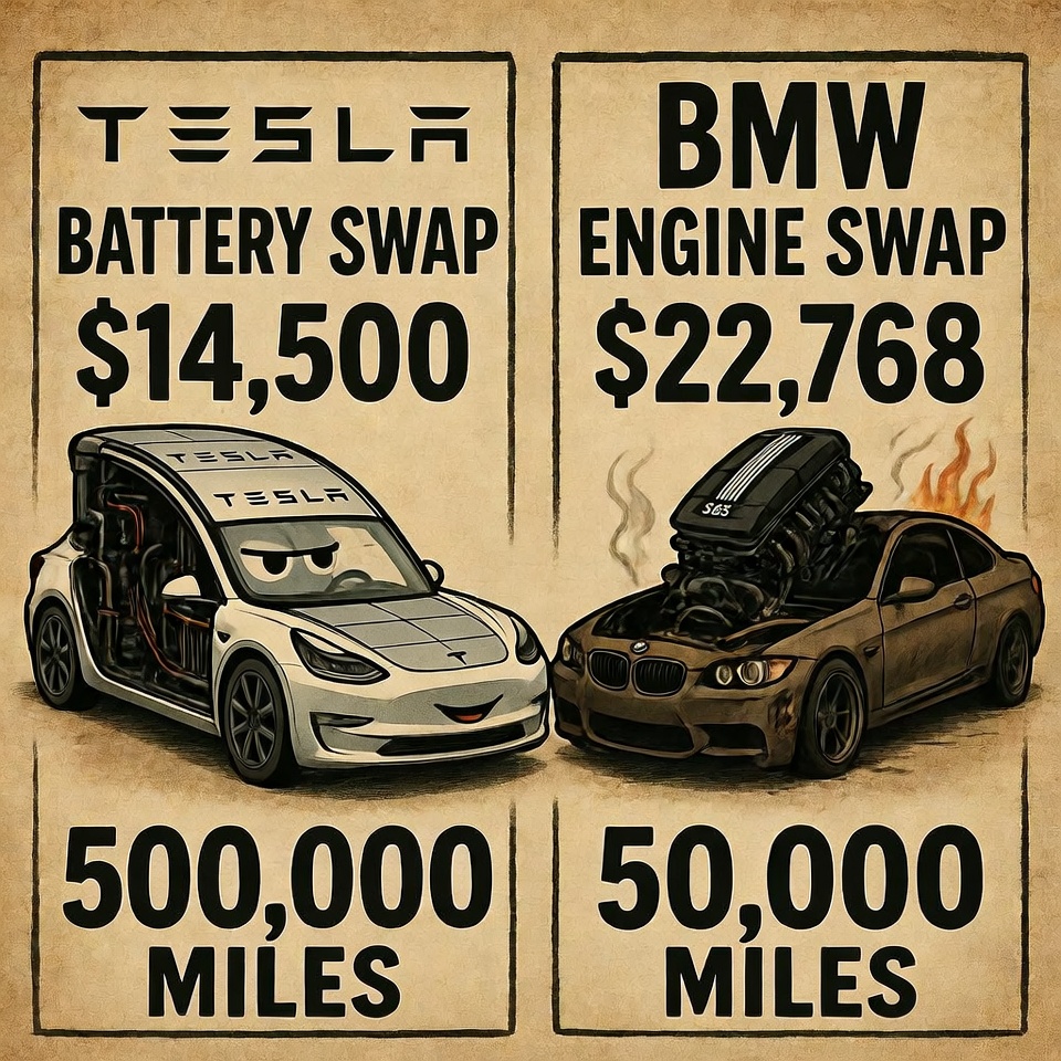 Every new Tesla: 8-year battery warranty from day one. BMW: 4 years and a prayer.