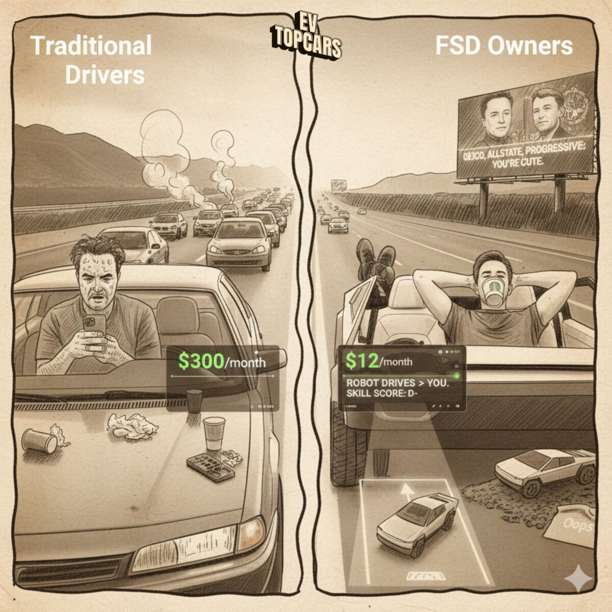 Traditional drivers: $300/month, crying in traffic. FSD owners: $12/month, sipping coffee while the car parallel parks itself perfectly and judges your old driving skills silently.